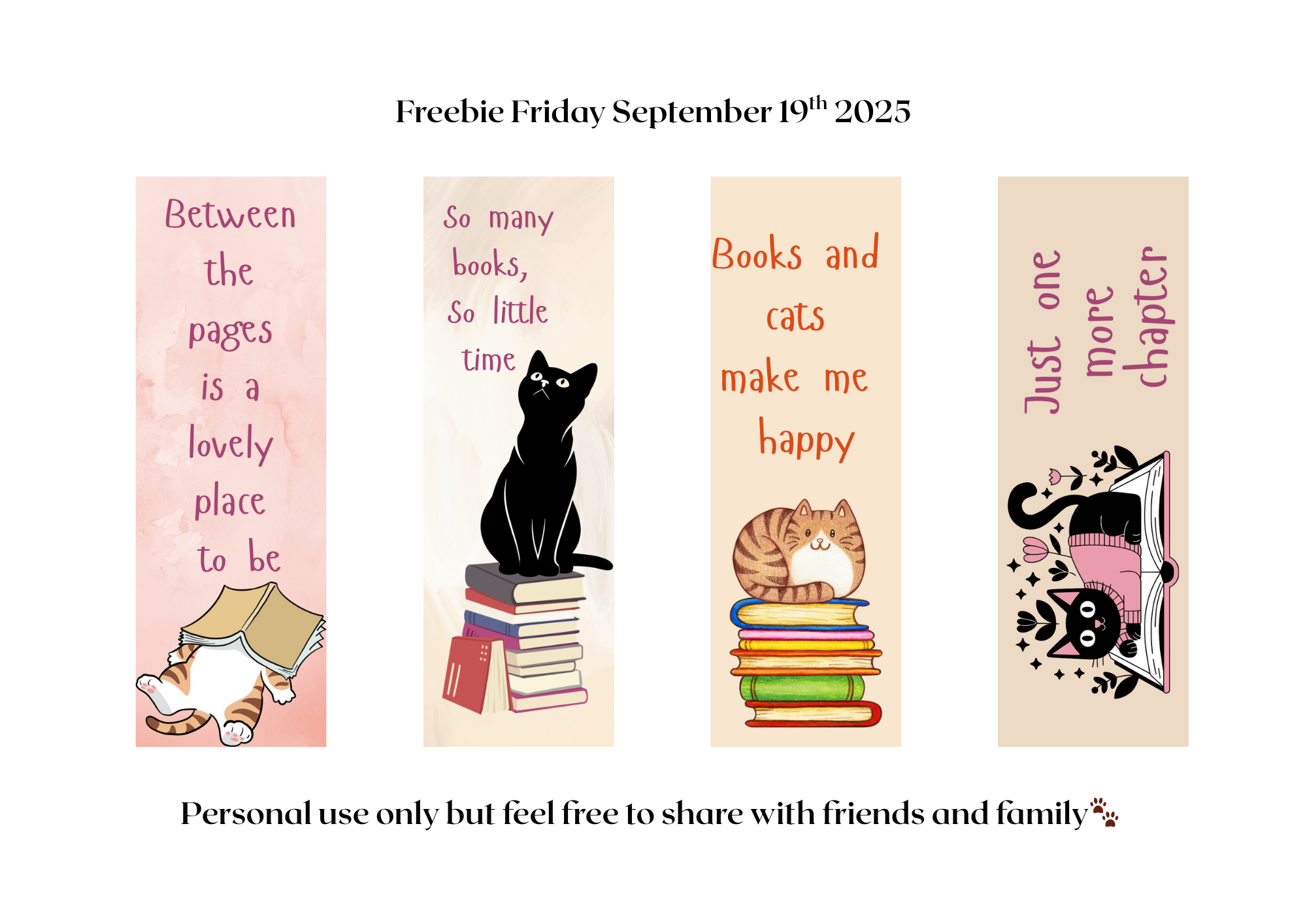 This week’s (Sept 19th, 2025) Friday Freebie, four cute cat themed bookmarks, are ready to download (below)
